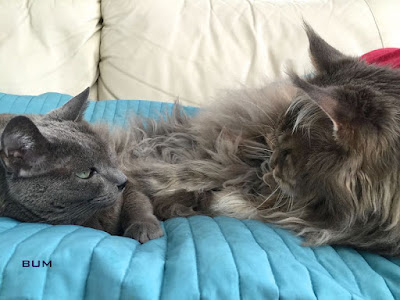 I oto stało się! Po rywalizacji spacerkowej na to, który z nas zdobędzie więcej roślin i murków i tym, kto rządzi na osiedlu, wylądowaliśmy na wspólnej przechadzce. Hmm. Doszło do bezpośredniego starcia futrzastych gigantów, czyli naszych kocioosób, a to oznaczało jedno: psowate i kotowate z drogi, ze szczególnym akcentem na psy! Nie dość, że zaprezentowaliśmy się w szelkach i smyczy, to jeszcze w tym samym kolorze szelek! Kociompromitacja. Niebieściuch pomałpował po mnie i nic sobie z tego nie robi.